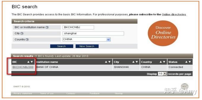 BIC or institution name 中填入中国银行的统一代码:BKCHCNBJ;City中填入您要查询的城市拼音:shanghai;