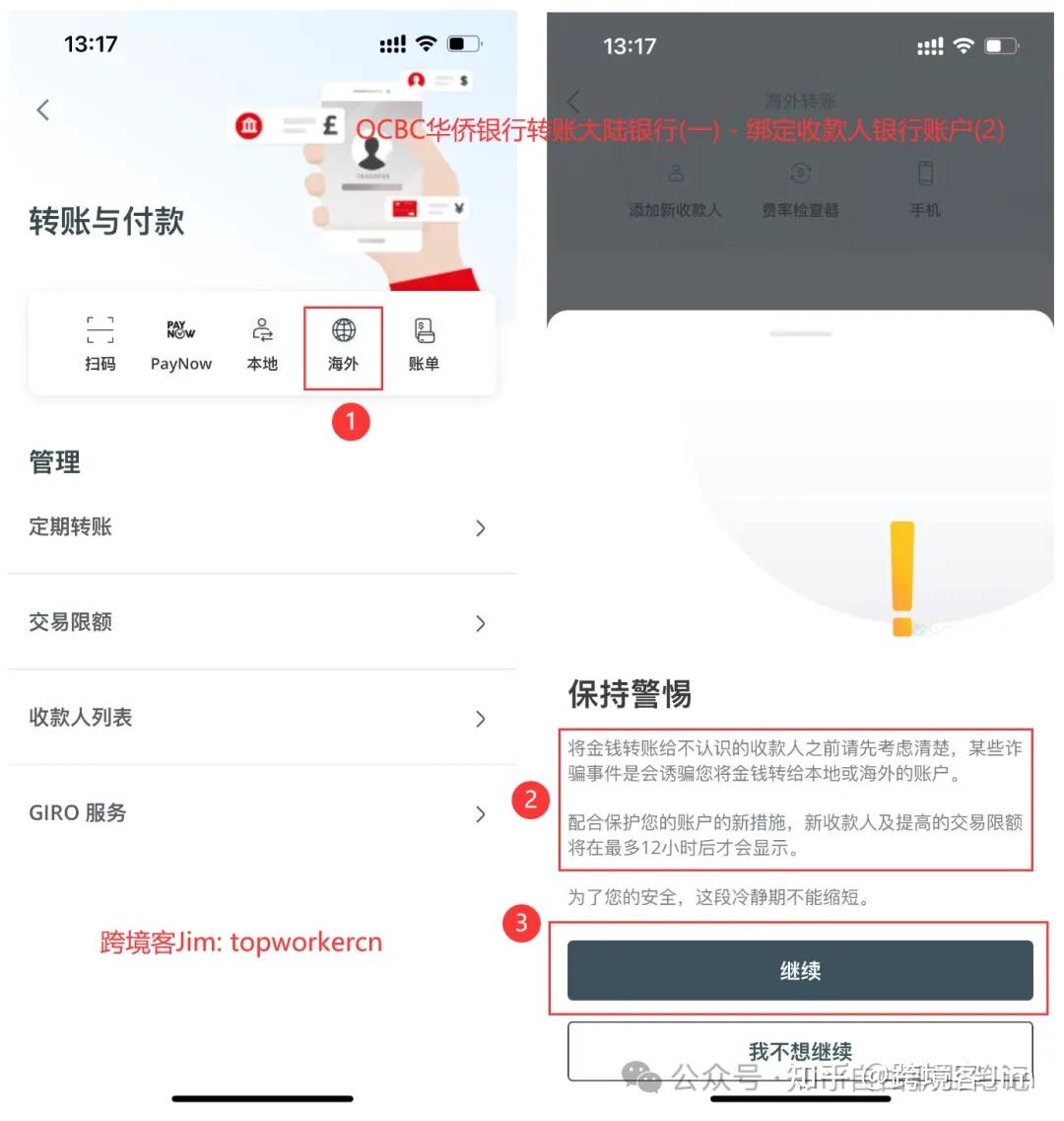 在打开的页面选择点击海外图标。因为大陆相对于新加坡来说是海外。在打开新页面之前有一个安全提示,提醒不要向陌生人转账,并且绑定的收款人在12个小时之后才能转账。