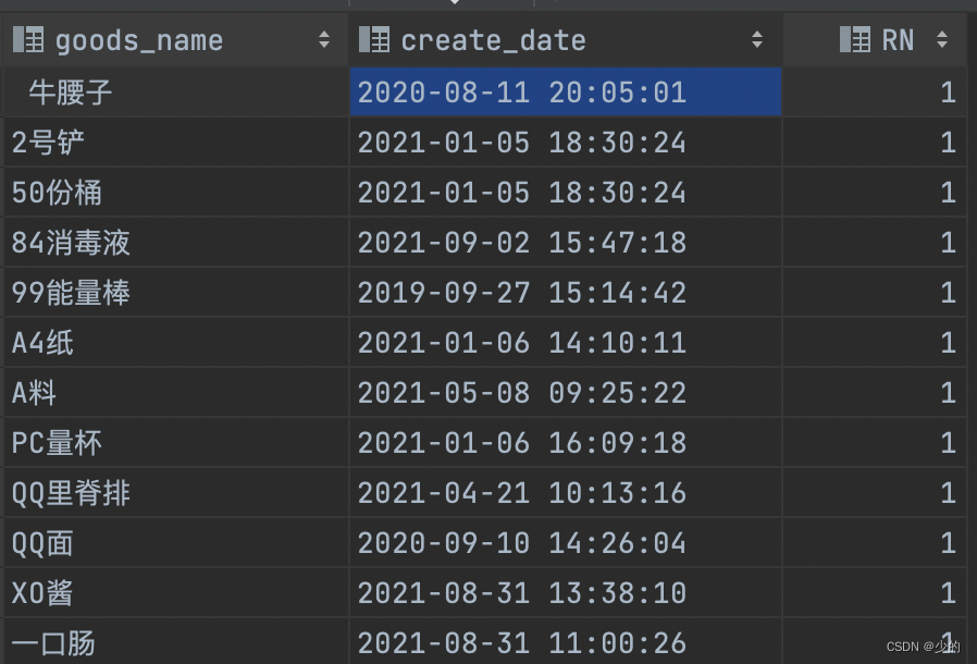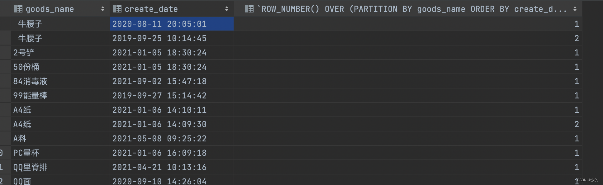 通过上面的语句可知,是按照goods_name字段分组,按create_date字段排序的。 如果需求就是只需查询出每个名字的最新创建时间记录,则可使用如下的语句, 由查询结果可知,名称相同但时间较早的数据被过滤掉了;