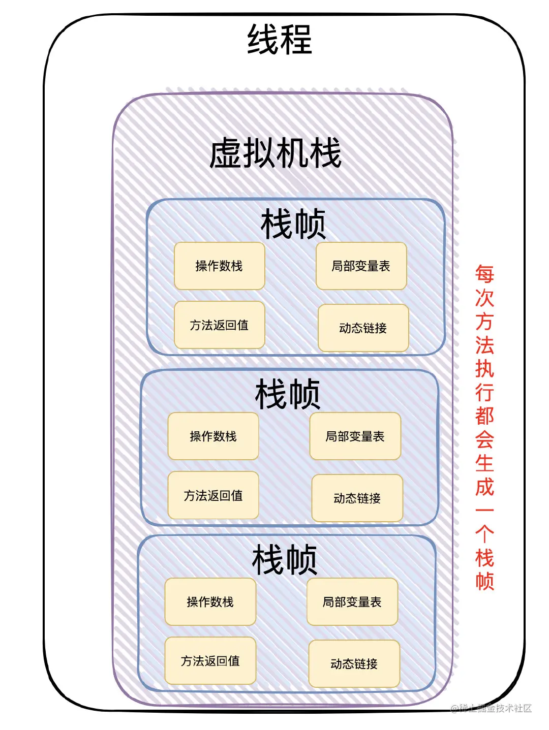 候选者:每个线程在创建的时候都会创建一个「虚拟机栈」,每次方法调用都会创建一个「栈帧」。每个「栈帧」会包含几块内容:局部变量表、操作数栈、动态连接和返回地址