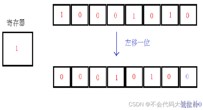 将操作数的所有位同时左移,最高位移出原操作数之外,最低位补0。逻辑左移一位相当于无符号数乘2。