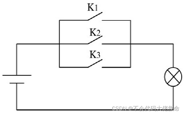”或”运算 电路中,“或”运算相当于开关的并联电路。 仅当所有开关都断开时,电路才无电流通过,如图所示。