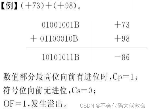 溢出的判断方法----单符号位法 单符号位法就是通过Cs和Cp两位进位状态的异或结果来判断是否溢出。 OF= Cs⊕Cp 若OF=1,说明结果溢出;若OF=0,则结果未溢出。也就是说,当符号位和数值部分最高位同时有进位或同时没有进位时,结果没有溢出,否则,结果有溢出。