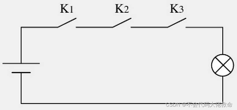 ”与”运算 在电路中,“与”运算相当于开关的串联电路。如图所示。 仅当所有开关都闭合时,电路才通电。