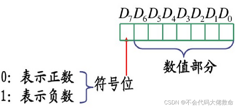 带符号二进制数算术运算 日常生活中遇到的数,除了无符号数,还有带符号数。对于带符号的二进制数,在计算机中通常用二进制数的最高位表示数的符号。对于一个字节型二进制数来说,D7位为符号位,D6~D0位为数值位。在符号位中,规定用“0”表示正,“1”表示负,而数值位表示该数的数值大小。