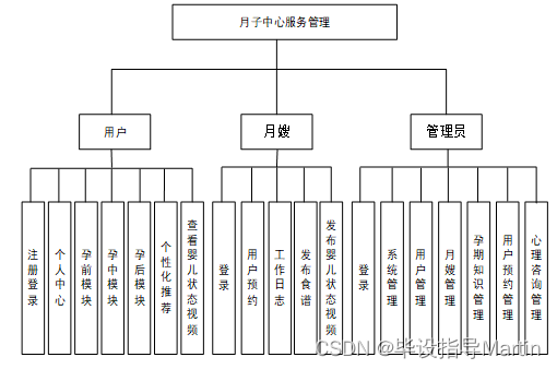 月子中心服务管理系统的模块设计主要包括三个方面:本次系统设定的角色主要是用户和月嫂,他们拥有各自不同的功能。