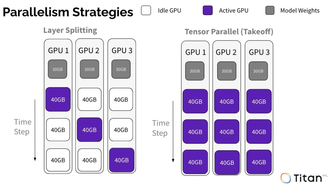 然而,这种按层分摊的方法会导致 GPU 在推理过程中有相当长的时间处于空闲状态。分摊模型的一个更好的方法是使用 张量并行——这正是我们在 Titan Takeoff 中所采用的策略。张量并行确保了 GPU 在整个推理过程中都能保持活跃,没有空闲时间。