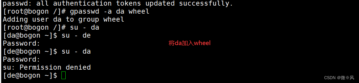 例如: su - boge gpasswd -a boge wheel