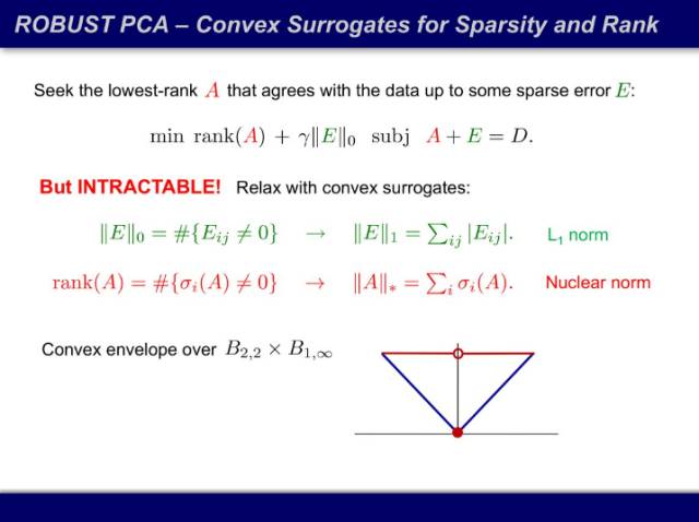 很长时间内,大家的办法都是启发式的,好用就是好用,也不知道为什么好用。压缩感知告诉我们,不要试图最小化 0 范式,要最小化它的凸包(convex hull)。矩阵的秩的凸包就是它的核范数(nuclear norm),即奇异值的和,就像 0 范数的凸包就是 1 范数(绝对值的和)。最小化凸包问题是一个凸优化问题,可以证明,该问题可以用多项式算法完成。