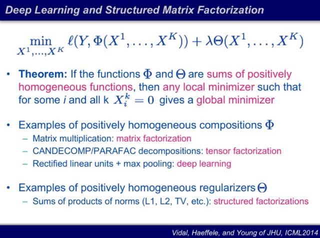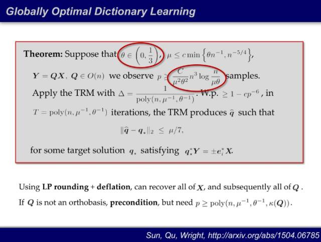 现在问题变成找到一个「黄金变换」,让我的数据最可压缩。这个问题的难点在于,这是一个非凸、非线性问题。Y ≈ Q * X,其中 Q 和 X 都不知道,而且通常对 Q 还有很多额外的结构上的要求(比如正交性)。之前的做法都是启发式的,固定 Q 找 X 或者反过来。甚至很长时间大家认为找这样的结构是没有意义的:即使找到了 Q,所需的数据也是指数倍的。如果 Q 是一个 n*n 矩阵,X 的秩是 k,那么 Y 需要的样本数就至少是从 n 选 k,是一个 n 和 k 的指数倍量级。15 年,哥伦比亚的学者发现:第一,需要的数据不用指数倍,达到 n^3 即可,第二,稀疏程度小于 1/3,满足上述两条件的情况下,利用 70 年代的信赖域算法(Trust Region Method),就能保证找到全局最优的变换。