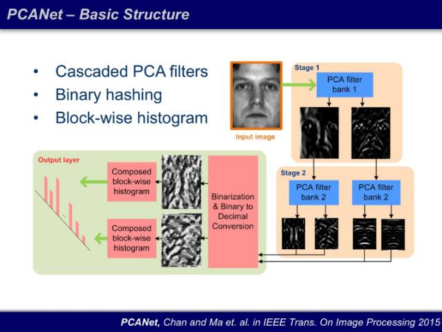 为了证明深度的必要性,我们打算先搭建一个最简单的网络结构 PCANet 做基线:两层的 PCA 筛选器,激活函数用比 ReLU 还简单的 Binary,并且直方图统计(histogram)替代均值或者最大值池化输出。结果很震惊:这个结构 15 年在 FERET 数据库上成为了当前**(state-of-art)。