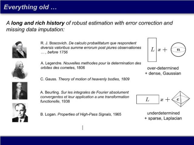原来解线性方程的时候方程数一定要多于未知量,参数矩阵 L 是长的,噪声则用高斯的方法求个最小方差。这个方法有两百年历史。1756 年,Boscovich 提出,如果噪声不是高斯的话,应该用一范数而不是二范数。有趣的是高斯是这篇文章的评审人,他评价道,「如果噪声比较大的时候一范数的效果确实比较好。」当时这只是一个想法,并没有相应的理论。