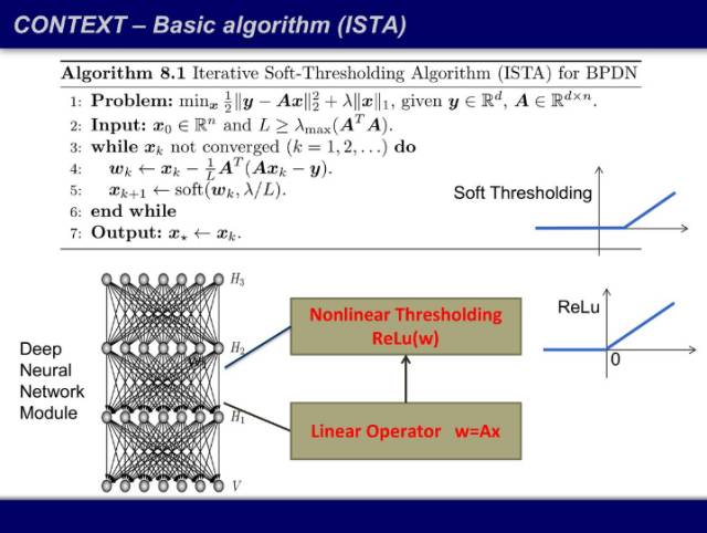 解下方用一范数惩罚过的方程(其中 x 有稀疏要求),然后进行迭代。将上一次迭代算出的 x 带入做一个线性变换,得到 w,w 经过一个软阈值函数(soft thresholding)后就得到这一次迭代的输出 x,重复该过程直到收敛。熟悉深度学习的同学会发现,如果我把用词改一改,把一次「迭代」叫做一个「层」,然后把这个迭代过程画出来,我们得到的结构是线性算子加阈值函数,而且阈值函数的样子和激活函数 ReLU 长得很像——这就是一个神经网络。