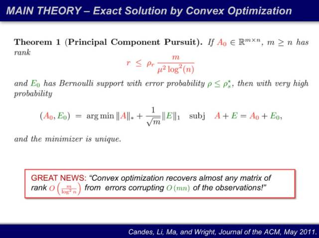 理论的突破让大家兴奋了一阵子随即冷静了下来:可计算并不等于实用。一张 1000*1000 的图片约一兆大小,D = A + E,A 和 E 都不知道时,这个优化问题的维度是两百万,而且目标函数不可导。传统凸优化方法解几百维的问题还好,数百万维的问题,参数连存都存不下。因此只能用一阶算法,不能用二阶算法。这和神经网络是一样的,你只能用随机梯度下降(stochastic gradient descent)去训练上千万个未知量。