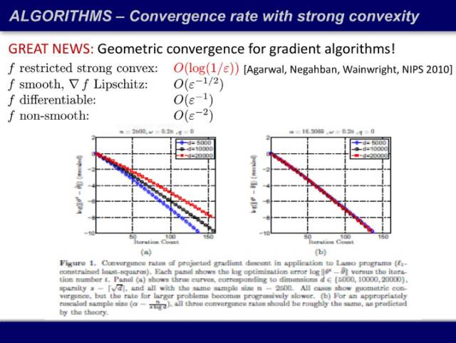 新的问题:为什么收敛这么快?它的收敛速度明明应该很慢,是 O(k^(-2)),为什么 20 次迭代就够了?Agarwal 证明了,我们对这一类问题在高维空间的认识又是有局限性的。在高维空间如果你的目标函数满足限制性强凸条件(restricted strong convex),一阶算法的收敛速度和二阶算法的收敛速度一样,就是指数的。