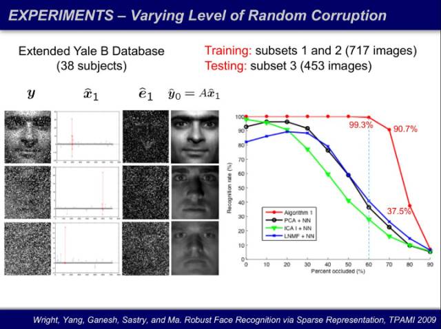 这些理论可以被用于图像处理。我们将人脸识别表示成一个线性方程,把一张人脸图像表达为一个库的线性叠加(x),把我表达不了的像素当成误差剔除出去(e)。其中 x 和 e 都是未知的,未知量个数远超过方程数。我们还将像素随机损毁,损毁 60% 的像素后,人已经无法对人脸进行识别,然而计算机仍然识别并实现接近百分之百的恢复。