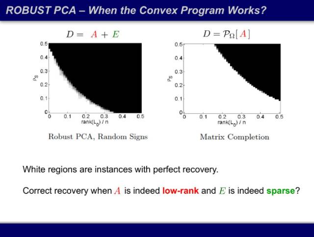 下图中,横轴是秩占矩阵规模的比例,纵轴是损毁比例,在不同的比例里面我们多次求凸优化的解,看看凸优化的解和原问题的解是否一致。白**域意味着所有模拟的解都一致,黑**域代表所有模拟的解都不一致。之前我们认为整个区域都是黑的,这个 NP 困难的问题无法求解,结果发现了非常漂亮的相变过程,在曲线上,凸优化的解完全可用。而可用区域也刚好是工程实践最关心的区域:数据确实有结构,损毁也没那么严重。