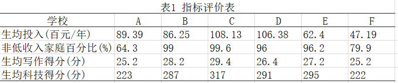 什么是多指标问题?《数学建模算法与应用》中给出了这样一个例子:某市教委需要对6所中学进行评价,其相应的指标如表格所示。表1中的生均投入和非低收入家庭百分比是输入指标,生均写作得分和生均科技得分是输出指标。请根据这些指标来评价学校。