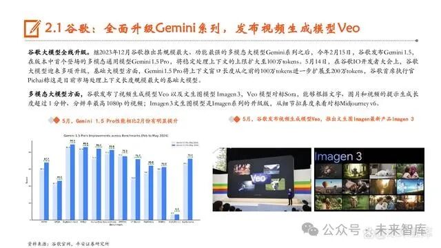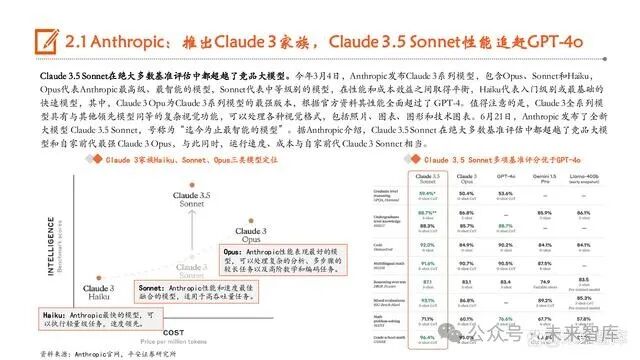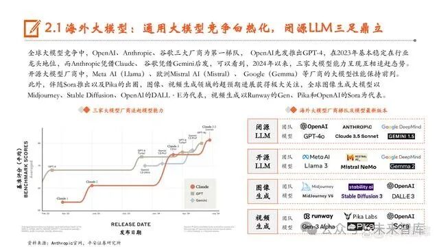全球大模型竞争中,OpenAI、Anthropic、谷歌三大厂商为第一梯队, OpenAI先发推出GPT-4,在2023年基本稳定在行业 龙头地位,而Anthropic凭借Claude、 谷歌凭借Gemini后发,可以看到,2024年以来,三家大模型能力呈现互相追赶态势。 开源大模型厂商中,Meta AI(Llama)、欧洲Mistral AI(Mistral)、 Google(Gemma)等厂商的大模型性能保持前列。 此外,伴随Sora推出以及Pika的出圈,图像、视频生成领域的超预期进展获得极大关注,全球图像生成大模型以 Midjourney、Stable Diffusion、OpenAI的DALL·E为代表,视频生成以Runway的Gen、Pika和OpenAI的Sora为代表。