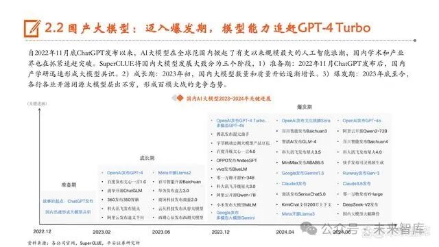 自2022年11月底ChatGPT发布以来,AI大模型在全球范围内掀起了有史以来规模最大的人工智能浪潮,国内学术和产业 界也在抓紧追赶突破。SuperCLUE将国内大模型发展大致分为三个阶段,1)准备期:2022年11月ChatGPT发布后,国内 产学研迅速形成大模型共识。2)成长期:2023年初,国内大模型数量和质量开始逐渐增长。3)爆发期:2023年底至今, 各行各业开源闭源大模型层出不穷,形成百模大战的竞争态势。