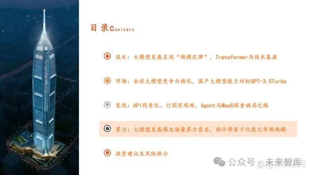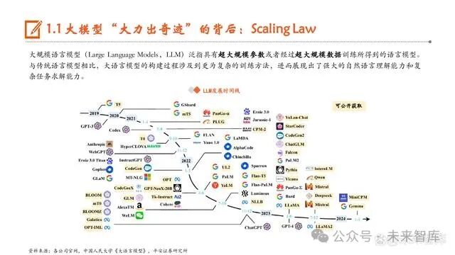 大模型发展普遍呈现“规模定律”(Scaling Law)特征,即:模型的性能与模型的规模、数据集大小和训练用的计算量之间存在幂律关系, 性能会随着这三个因素的指数增加而线性提高。大模型的参数规模远大于传统深度学习模型,传统模型参数量通常在数万至数亿之间,大 模型的参数量则至少在亿级,并已发展到过万亿级的规模。如OpenAI的GPT-1到GPT-3,参数量从1.1亿大幅提升至1746亿,GPT-4非官方 估计达到万亿参数(根据Semianalysis消息,GPT-4包含1.8万亿参数),实现性能的突破。根据Google论文,这种大模型具有但小模型不具 有的能力通常被称为“涌现能力”(Emergent Abilities)。