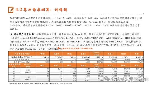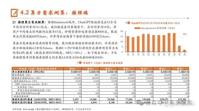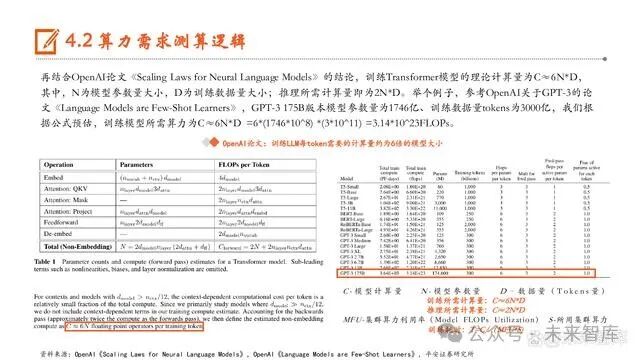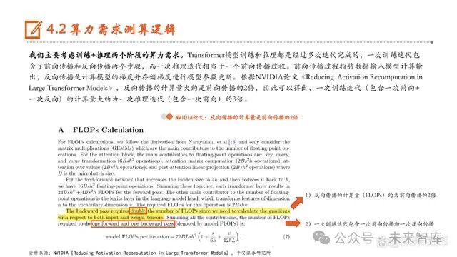 我们主要考虑训练+推理两个阶段的算力需求。Transformer模型训练和推理都是经过多次迭代完成的,一次训练迭代包 含了前向传播和反向传播两个步骤,而一次推理迭代相当于一个前向传播过程。前向传播过程指将数据输入模型计算输 出,反向传播是计算模型的梯度并存储梯度进行模型参数更新。根据NVIDIA论文《Reducing Activation Recomputation in Large Transformer Models》,反向传播的计算量大约是前向传播的2倍,因此可以得出,一次训练迭代(包含一次前向+ 一次反向)的计算量大约为一次推理迭代(包含一次前向)的3倍。