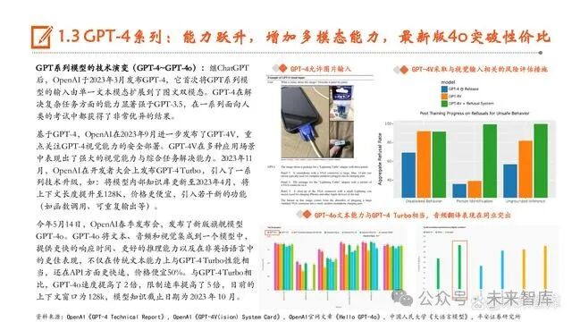 OpenAI发布文生视频大模型Sora,在全球视频大模型领域取得里程碑式进展。今年2月15日,OpenAI在官网正式发布Sora,根据OpenAI官网 介绍,Sora可以在保持视觉质量和遵循用户的文本提示的情况下,生成长达1分钟的视频,遥遥领先于以往的视频生成时长。 GPT-4o实现性能与实用性双突破,有望加速大模型应用落地。5月14日,OpenAI在春季发布会上推出GPT-4o,并表示将免费提供给所有用 户使用。GPT-4o可接受文本、音频和图像的任意组合作为输入、输出,在英语文本和代码方面的性能可对标GPT-4 Turbo,同时在API 中也 更快且便宜50%。根据OpenAI官网信息,在GPT-4o之前,使用语音模式与ChatGPT对话,GPT-3.5/GPT-4的平均延迟分别为2.8⁄5.4秒。而 GPT-4o可以在短至232毫秒的时间内响应音频输入,平均时长为320毫秒,与人类在一次谈话中的响应时间相似。 7月18日,OpenAI正式推出了GPT-4o mini,将取代ChatGPT中的旧模型GPT-3.5 Turbo,向ChatGPT的免费用户、ChatGPT Plus和团队订阅用 户开放。OpenAI表示,GPT-4o mini的成本为每百万输入标记(token)15美分和每百万输出标记60美分,比GPT-3.5 Turbo便宜超过60%。