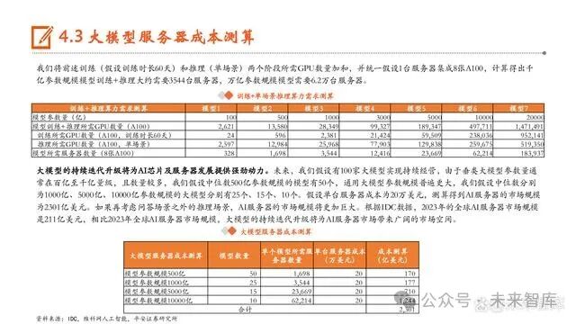 大模型的持续迭代升级将为AI芯片及服务器发展提供强劲动力。未来,我们假设有100家大模型实现持续经营,由于垂类大模型参数量通 常在百亿至千亿量级,且数量较多,我们假设中位数500亿参数规模的模型有50个,通用大模型参数规模普遍更大,我们假设中位数分别 为1000亿、5000亿、10000亿参数规模的大模型分别有25个、15个、10个。假设单台服务器成本为20万美元,测算得到AI服务器的市场规模 为2301亿美元。如果再考虑问答场景之外的推理场景,AI服务器的市场规模将更加巨大。根据IDC数据,2023年的全球AI服务器市场规模 是211亿美元,相比2023年全球AI服务器市场规模,大模型的持续迭代升级将为AI服务器市场带来广阔的市场空间。