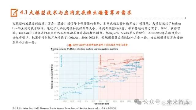 大模型的发展受到能源、算力、显存、通信等多种资源的制约,本章我们主要讨论算力。训练端,大模型延续了Scaling Law的主流的技术路线,通过扩大参数规模和数据集的大小,来提升模型的性能,带来持续的算力需求,同时,在推理 端,以ChatGPT为代表的AI应用也正在驱动算力需求指数级增长。根据Jaime Sevilla等人的研究,2010-2022年在深度学习 兴起背景下,机器学习训练算力增长了100亿倍,2016-2022年,常规模型算力每5至6个月翻一倍,而大规模模型算力每10 至11个月翻一倍。