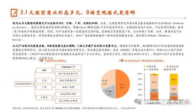 我们认为大模型收费模式可以总结为API、订阅、广告、定制化四种。首先,大模型最常见的商业模式基本遵循软件行业的SaaS(Software as a Service),通用大模型通常会采取API模式,根据tokens/调用次数/产出内容量等计价,大模型形成AI产品后,可以采用订阅制,按月 /季/年向用户收取使用费。同时,AI产品若具备一定程度的流量价值,能够吸引商家投放广告,从而收取广告费。此外,服务内容可以 不限于大模型本身,针对付费能力强的企业客户,部分厂商会提供软硬件一体的定制化解决方案,我们称之为MaaS(Model as a Service)。 从AI产品商业化程度来看,B端变现模式更加清晰,C端大多数产品仍然以免费为主。根据量子位智库,面向B端的AI产品从通用场景到垂 直赛道分布较均匀,收入模式以会员订阅和按需付费为主,商业模式较为清晰,虽然(纯B端)市场占比只有31%,但80%以上的产品均 能实现营收。C端AI产品以智能助手以及图像生成类的生产力工具为主,虽然用户量大(纯C端占比50%以上),但近50%的产品当前仍未 有明确的收入模式,以免费为主。