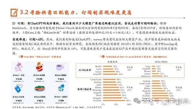 2)订阅:有ChatGPT的成功案例,我们看到不少大模型厂商通过构建AI应用,尝试走付费订阅的路径。根据 Similarweb,月之暗面的智能助手Kimi Chat从推出时16万访问量到2024年2月的292万,再到3月的1219万,伴随其访问量的 跃升, 5月Kimi上线“给Kimi加油”付费选项(最便宜的选项99元/93天≈1.06元/天),可获得高峰期优先使用权益。 实现难度:订阅>API。然而,我们看到即使是ChatGPT、runway等具有代表性的大模型产品,用户留存度和粘性也尚未 达到现有领先C端应用的水平。根据红杉资本研究,全球领先的C端应用拥有 60-65% 的 DAU/MAU,其中WhatsApp是 85%。相比之下,AI -first应用的中位数为 14%,可能意味着用户还未在这些AI产品中找到能够每天使用它们的足够价 值。