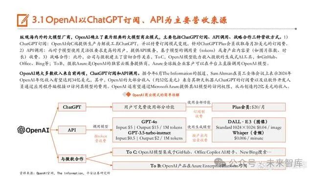 1)API:是大模型厂商最为普遍的营收模式,但我们也注意到由于大模型性能趋向同质化,全球API价格呈现下降趋 势。今年5月,作为行业风向标的OpenAI发布GPT-4o,面向ChatGPT所有付费和免费用户发布,支持免费试用,API价格 比GPT-4-turbo降低了50%,输入价格低至5美元/百万tokens;谷歌发布Gemini 1.5 Flash时也将输入价格定为0.35美元/百万 tokens。国内来看,5月6日,AI公司深度求索(DeepSeek)率先宣布降价,其发布的第二代MoE大模型DeepSeek-V2定为 0.001元/千tokens的输入价格与0.002元/千tokens的输出价格,随后我们看到,智谱 AI、火山引擎、阿里云、百度、科大 讯飞、腾讯云等国内主要大模型厂商迅速跟进。