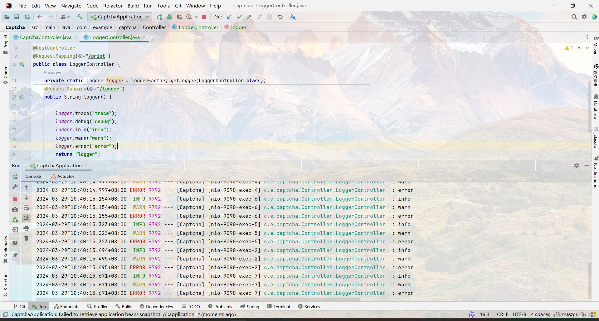 我们发现这里并没有出现DEBUG级别和TRACE级别的日志,这是因为Spring的默认参数设置是INFO级别,只会显示这个级别以上的日志文件,我们如果想看到低级别的日志可以去配置文件中修改参数即可