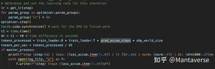 在训练阶段,我们可以按照单一模型的训练方式构建代码。在获得loss之后,使用loss.backward()积累梯度。这里的require_backward_grad_sync本质上是在梯度积累步长不为1时,通过在前几步中减少跨GPU的梯度同步,来优化训练速度。