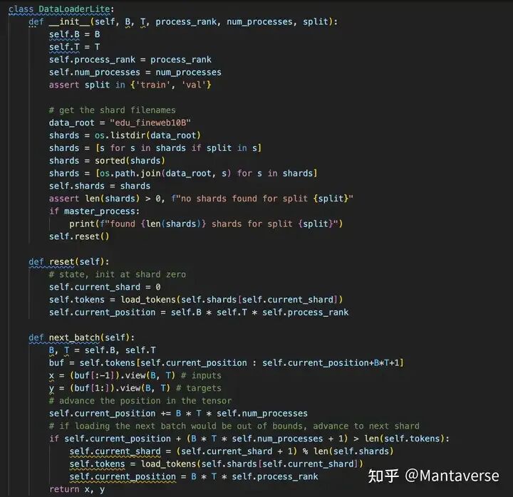 由于使用了多GPU训练,需要调整DataLoader让每个GPU获得不一样的训练数据。我们的DataLoader会根据GPU的编号,使用B * T * self.process_rank的方式加载数据。例如,如果我们有4个GPU,第0个DataLoader加载的数据就是第0,4,8,12个chunk,第1个GPU加载的是1,5,9,13个chunk,以此类推。