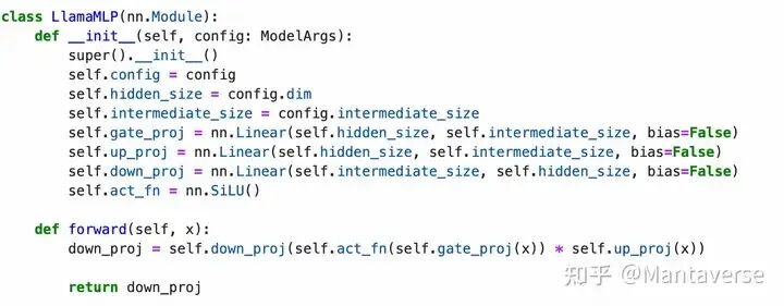 MLP层通常包含两个线性投影和一个非线性激活函数(如SiLU),用于增加模型的表达能力。具体步骤是:
