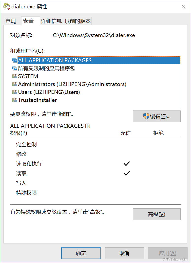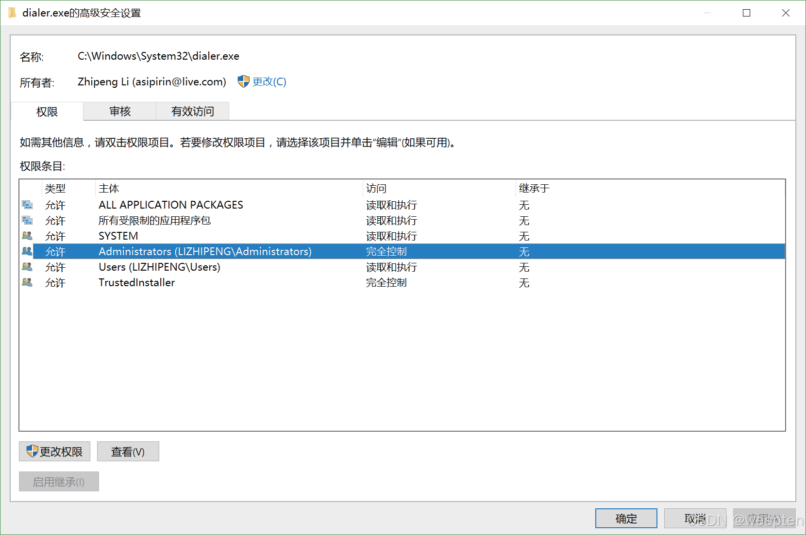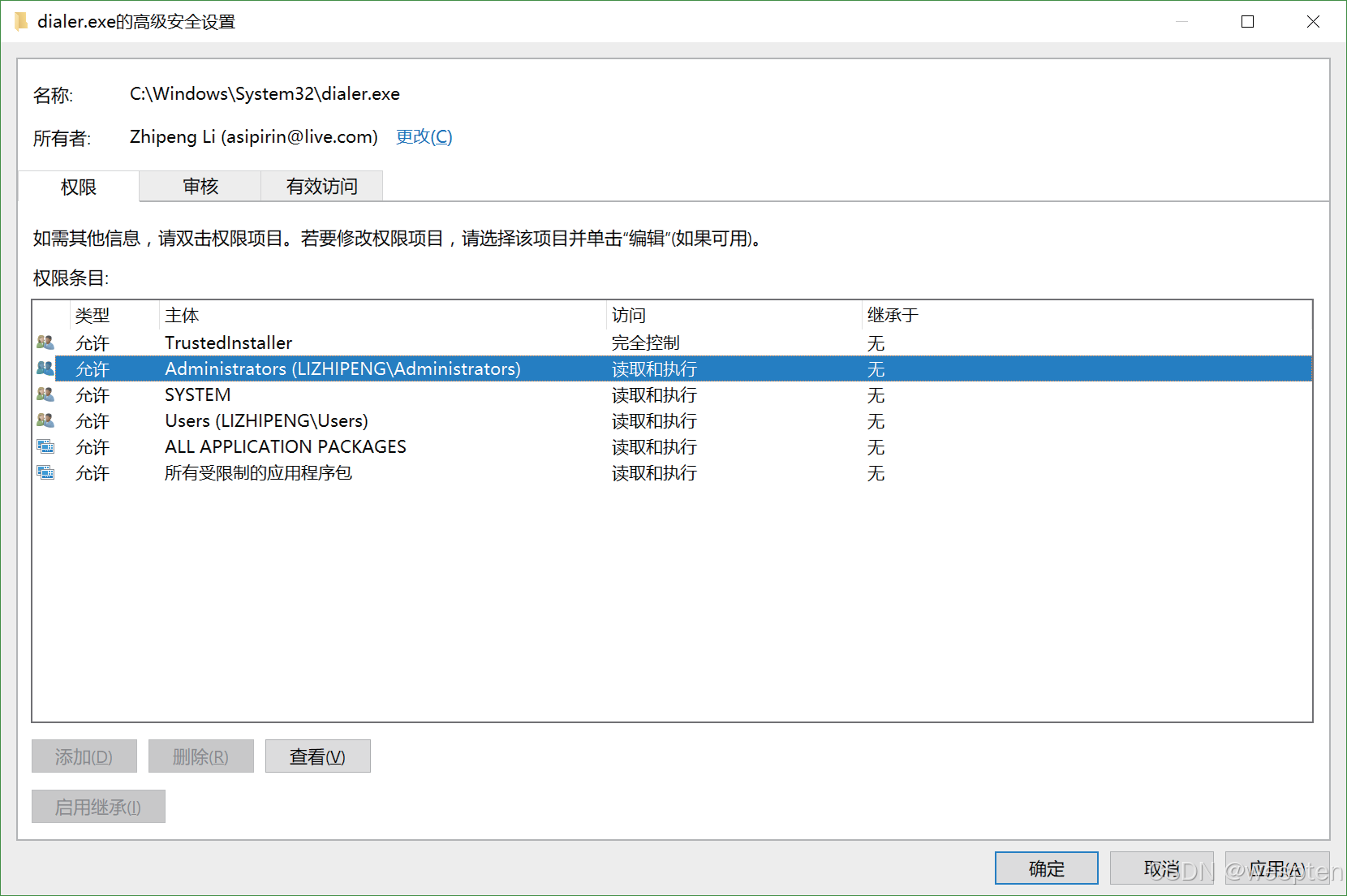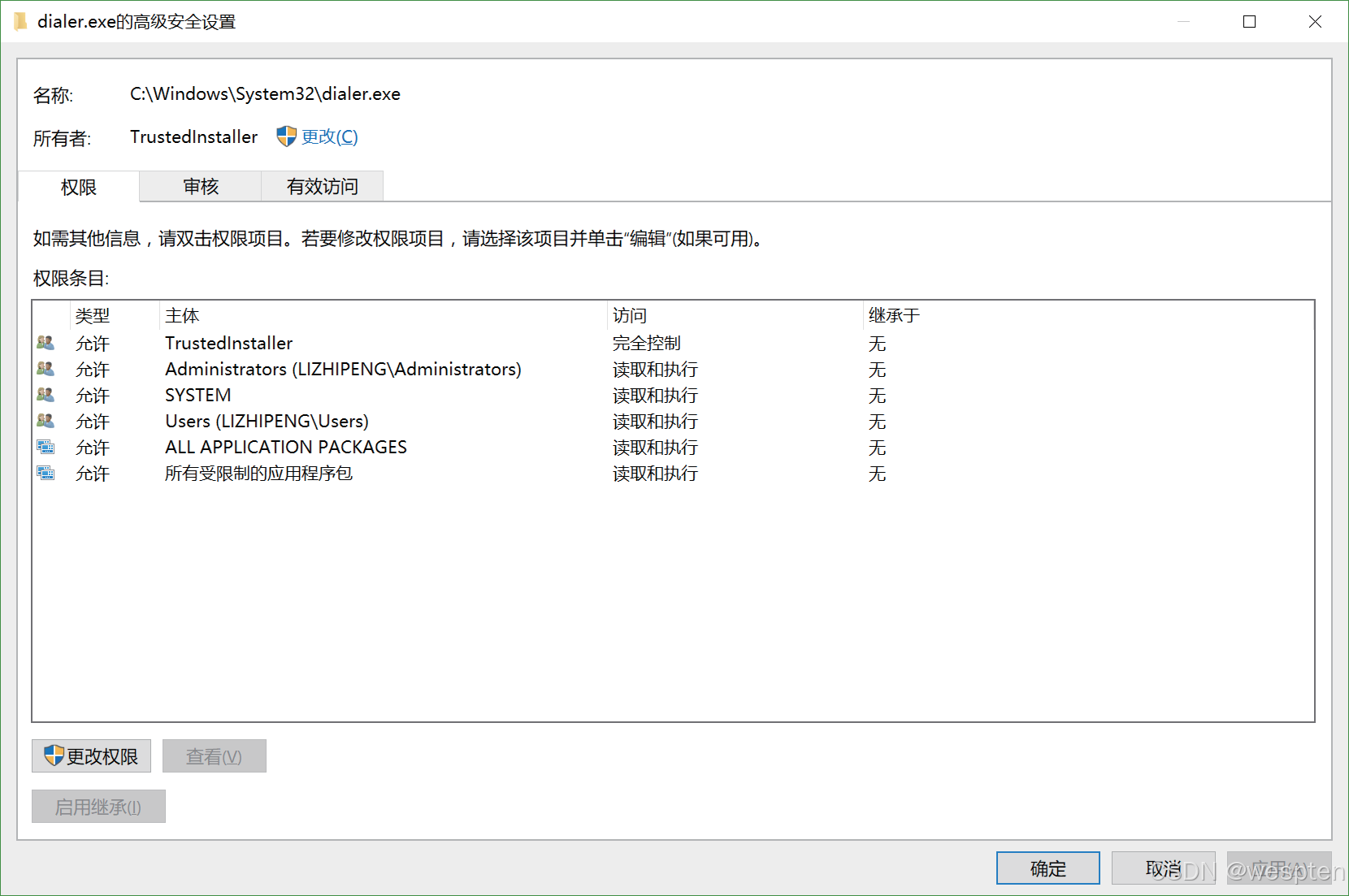 ③ 在打开的文件高级安全设置界面中,可以看到此文件的权限所有者为 TrustedInstaller,以及该账户所具有的访问权限,如下图所示。