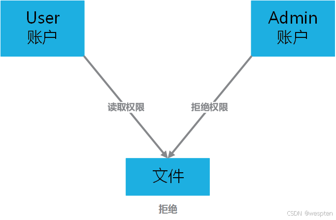 - 拒绝权限高于其他权限:拒绝权限可以覆盖所有其他的权限,甚至作为一个组的成员有权访问文件夹或文件,但是该组被拒绝访问,则该用户本来具有的所有权限都会被锁定,从而无法访问此文件夹或文件。此权限规则会导致权限累积规则失效,如下图所示。