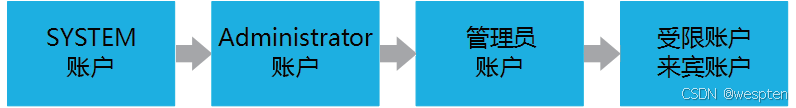 - SYSTEM 账户:Windows 中的最高权限账户,也是一个虚拟账户,操作系统核心的程序和服务都需以 SYSTEM 账户身份运行。