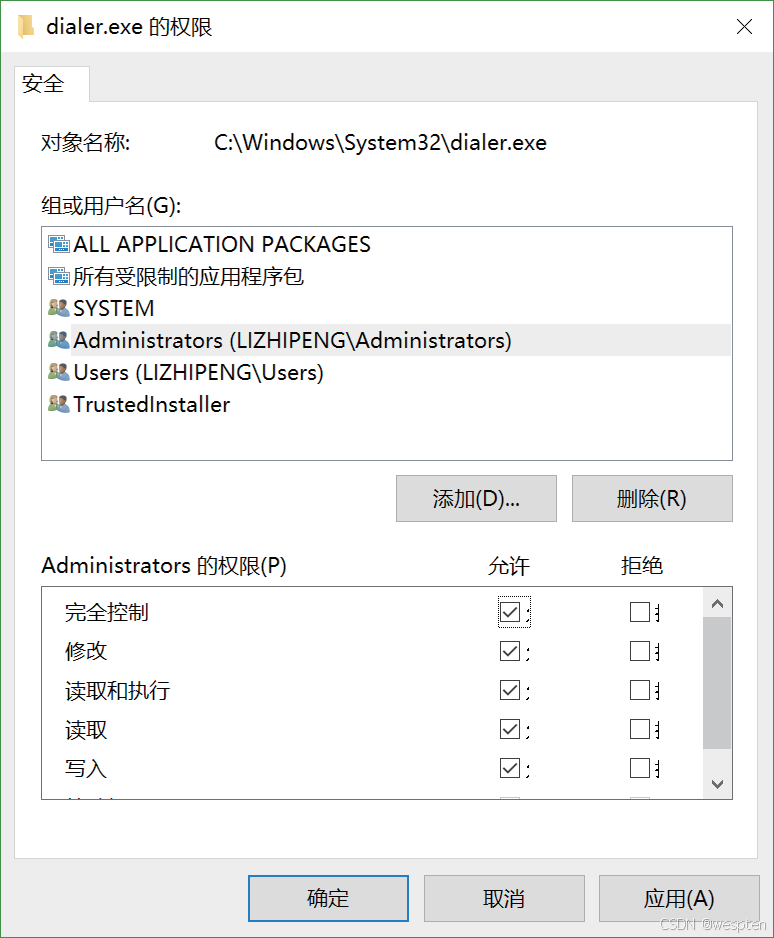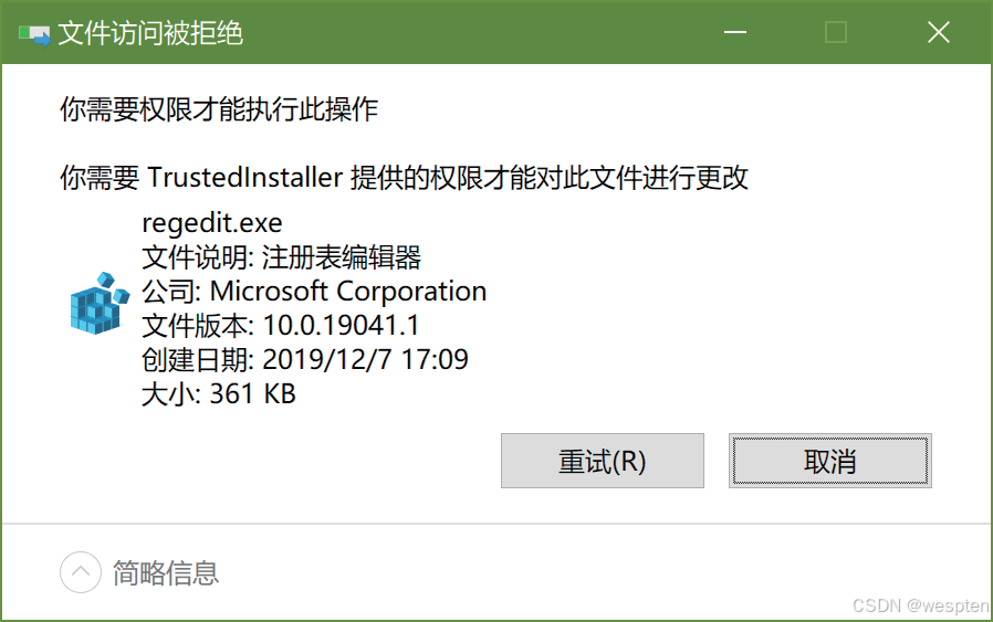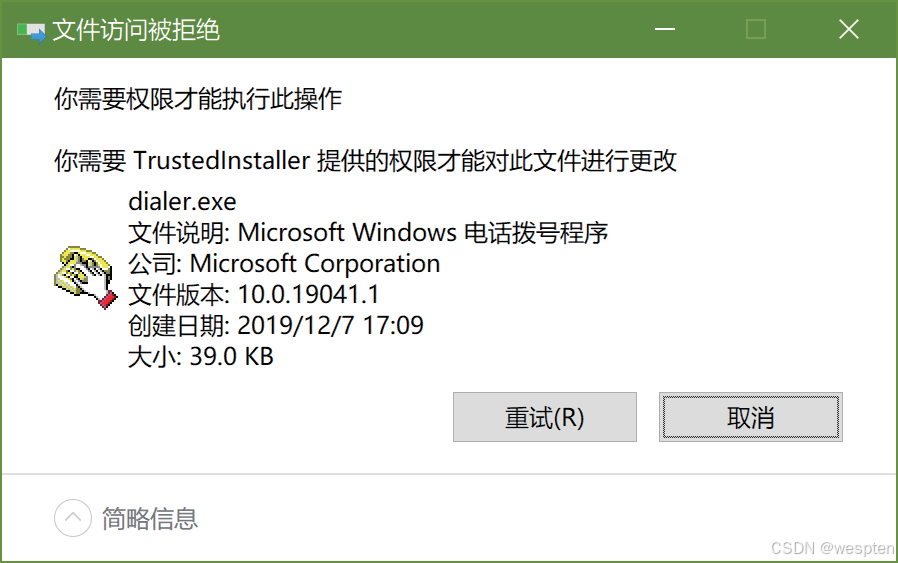 - TrustedInstaller 账户:TrustedInstaller 为虚拟账户。默认情况下,所有系统文件的完全控制权限都属于该账户。如果需删除操作系统文件,操作系统就会要求用户提供 TrustedInstaller 权限,如下图所示。