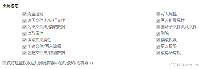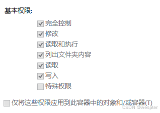 - 完全控制:该权限允许用户对文件夹、子文件夹、文件进行全权控制,例如修改文件的权限、获取文件的所有者、删除文件的权限等,拥有完全控制权限就等于拥有了其他所有的权限。