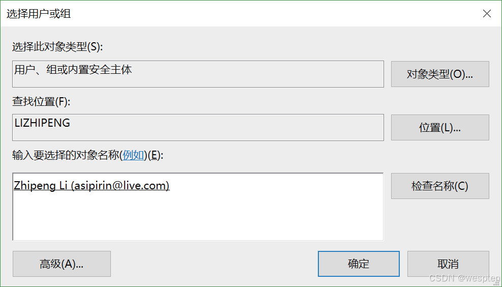 ④ 单击下图所示的【更改】选项,在打开的【选择用户或组】界面中输入要更改所有权的账户,单击【检查名称】可以自动识别账户的完整信息,然后单击【确定】。