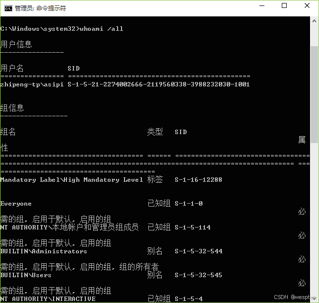 对于用户账户和用户组,Windows 10 使用安全标识符(Security Identifi er, SID)对其进行识别,每一个用户账户或用户组都有其唯一的 SID。即便是删除一个账户,然后重新创建同名账户,其 SID 也不同。可以使用 whoami 命令行工具查看 SID,在命令提示符中输入 whoami /all 命令,即可查看计算机所有用户账户或用户组的 SID以及其他信息,如下图所示。