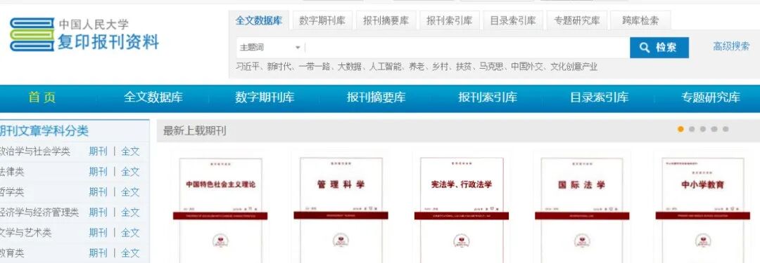 中国人民大学复印报刊资料库,简称“人大复印库”,是人大数媒科技(北京)有限公司以人民大学书报资料中心的复印报刊资料系列数据库为内容基础,辅以检索功能、期刊、论文推荐而成的人文科学、社会科学资料库。