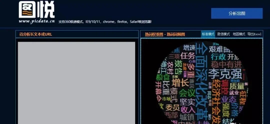 图悦是一款在线的热词分析工具,它可以对于载入文本或指向文本内容的链接进行词频提取和词语(重要性)权重分析,并可以导出成excel格式的文件,便于后期分析和处理。