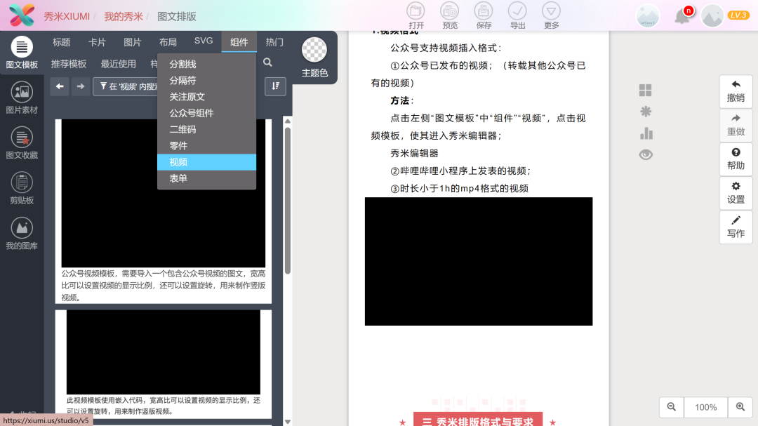 点击左侧“图文模板”中“组件”“视频”,点击公众号视频模板(视频中的第一个),使其进入秀米编辑器;