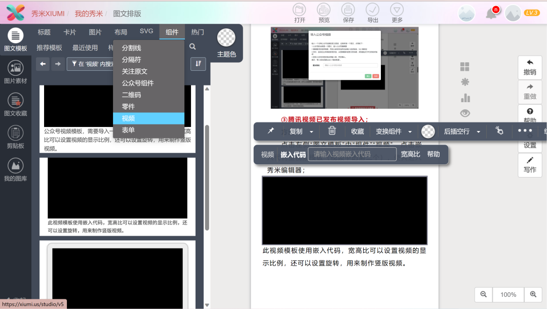点击左侧“图文模板”中“组件”“视频”,点击嵌入代码型视频模板(视频中的第二个),使其进入秀米编辑器;