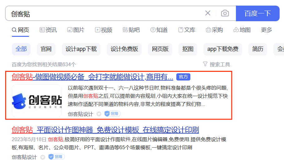 1.搜索“创客贴”,如图红框所示即为创客贴官网。