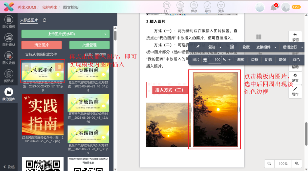 方法(二):可选择带照片格式的模板,选中模板中图片部分(选中后图片四周会有边框),再点击“我的图库”中欲插入的照片,便可实现在模板对应处插入照片。