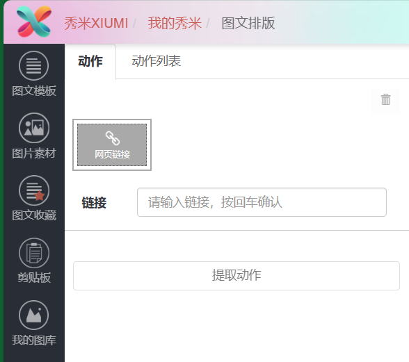 图文排版界面左侧“我的图库”点击“上传照片”,进行图片导入。